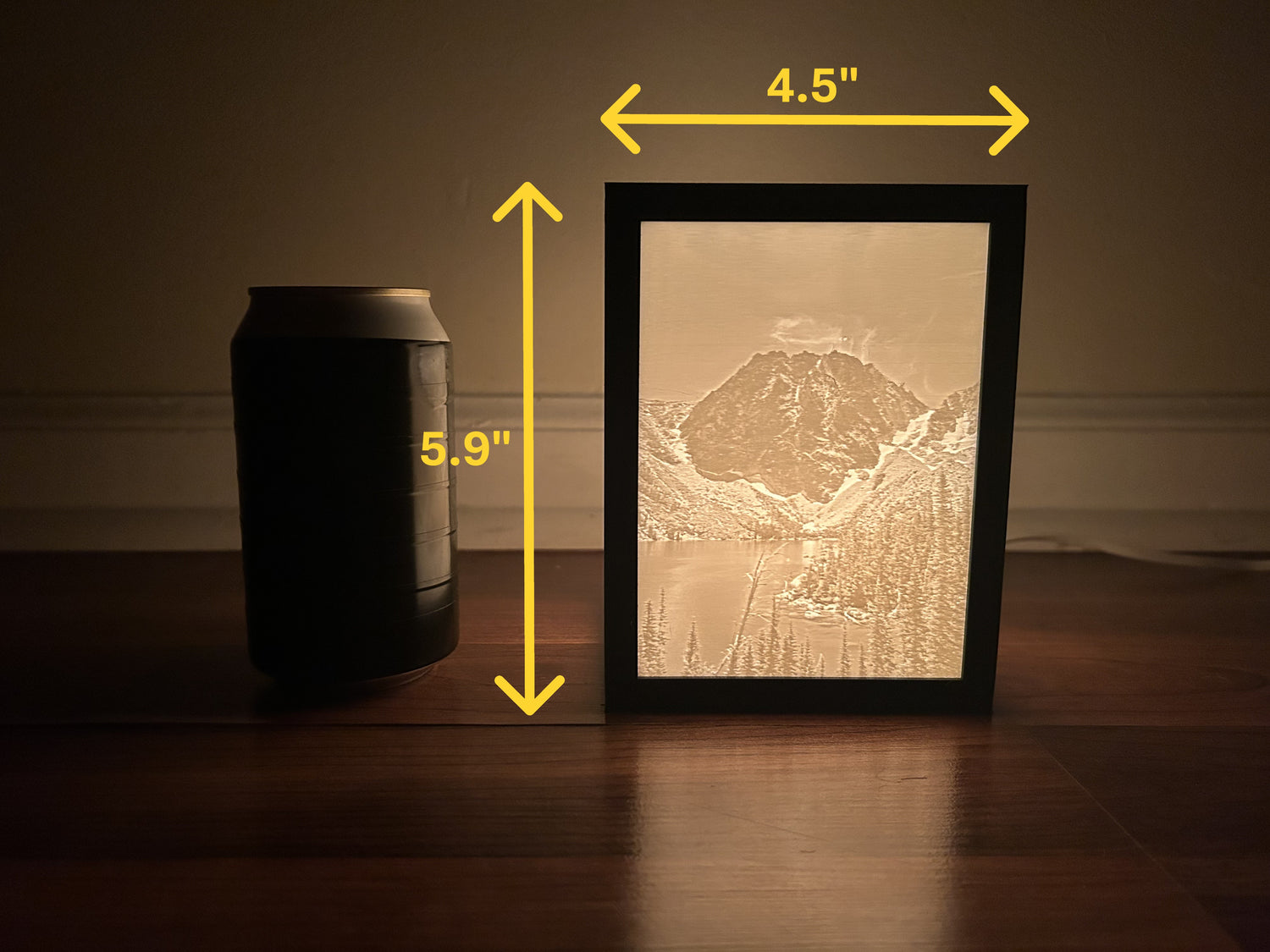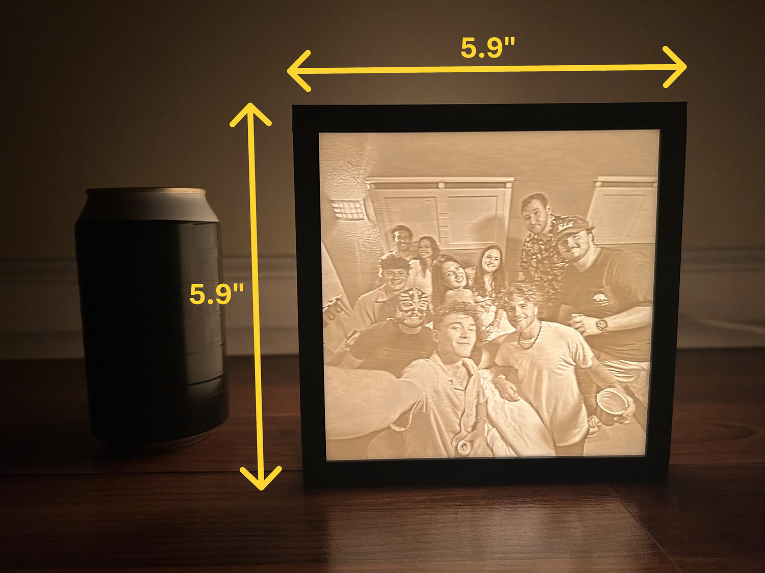 The large lithophane box is 5.9x5.9 inches. The lithophane itself is 5.3x5.3 inches which allows for excellent detail and large presence in any setting. Use the standard size aluminum can as a visual reference for the size.