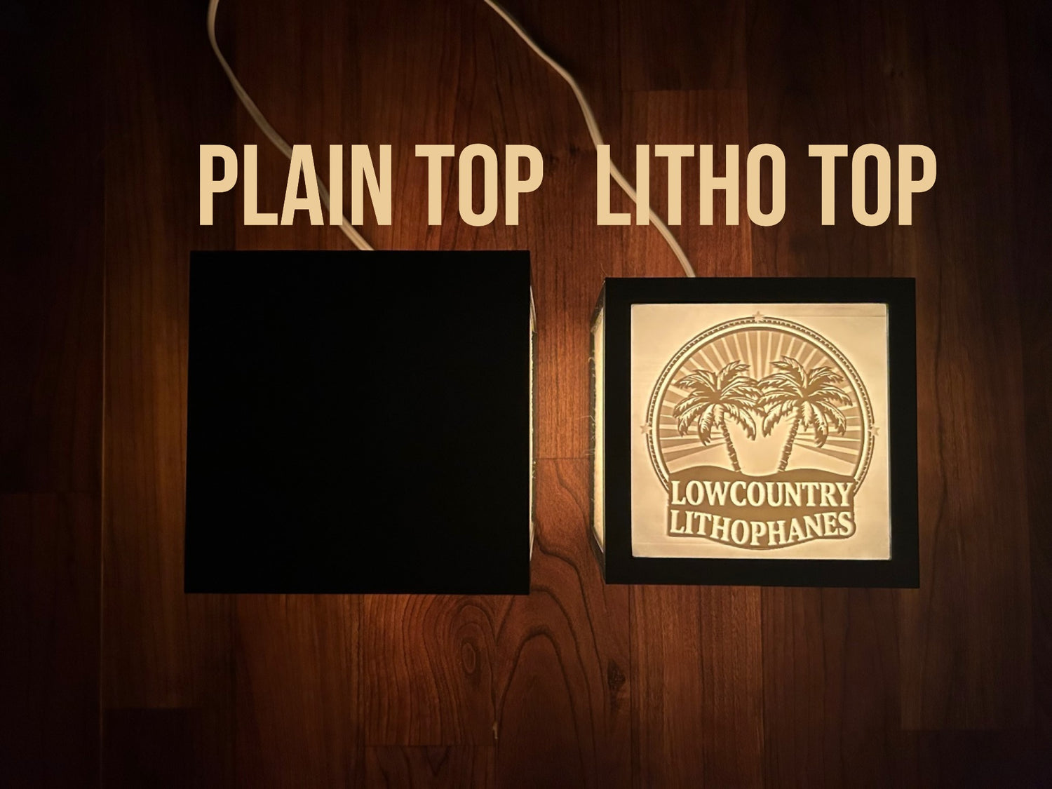 Choose between the default plain top or the lithophane top for an additional cost. Lithophanes can easily be swapped out of the top as well to fit your desired display preference. Please select product for pricing details.